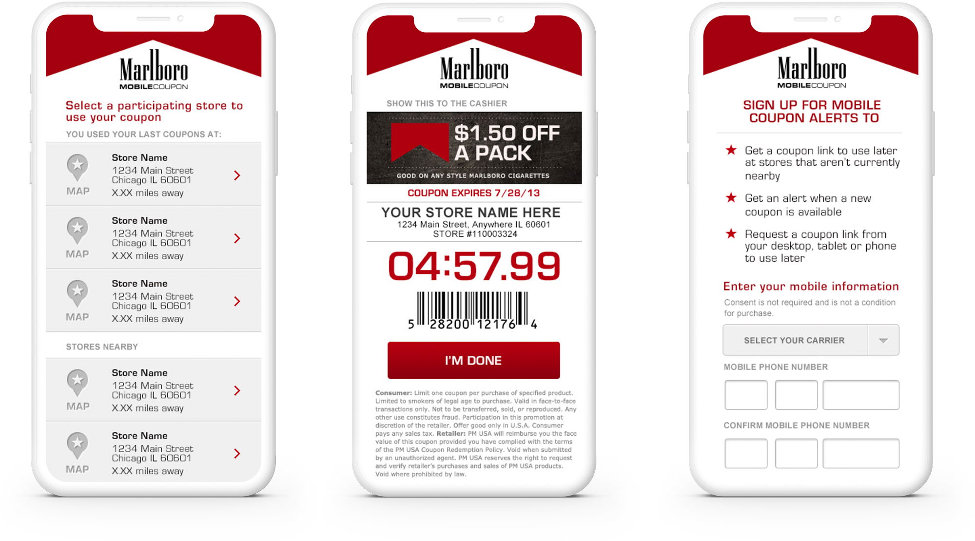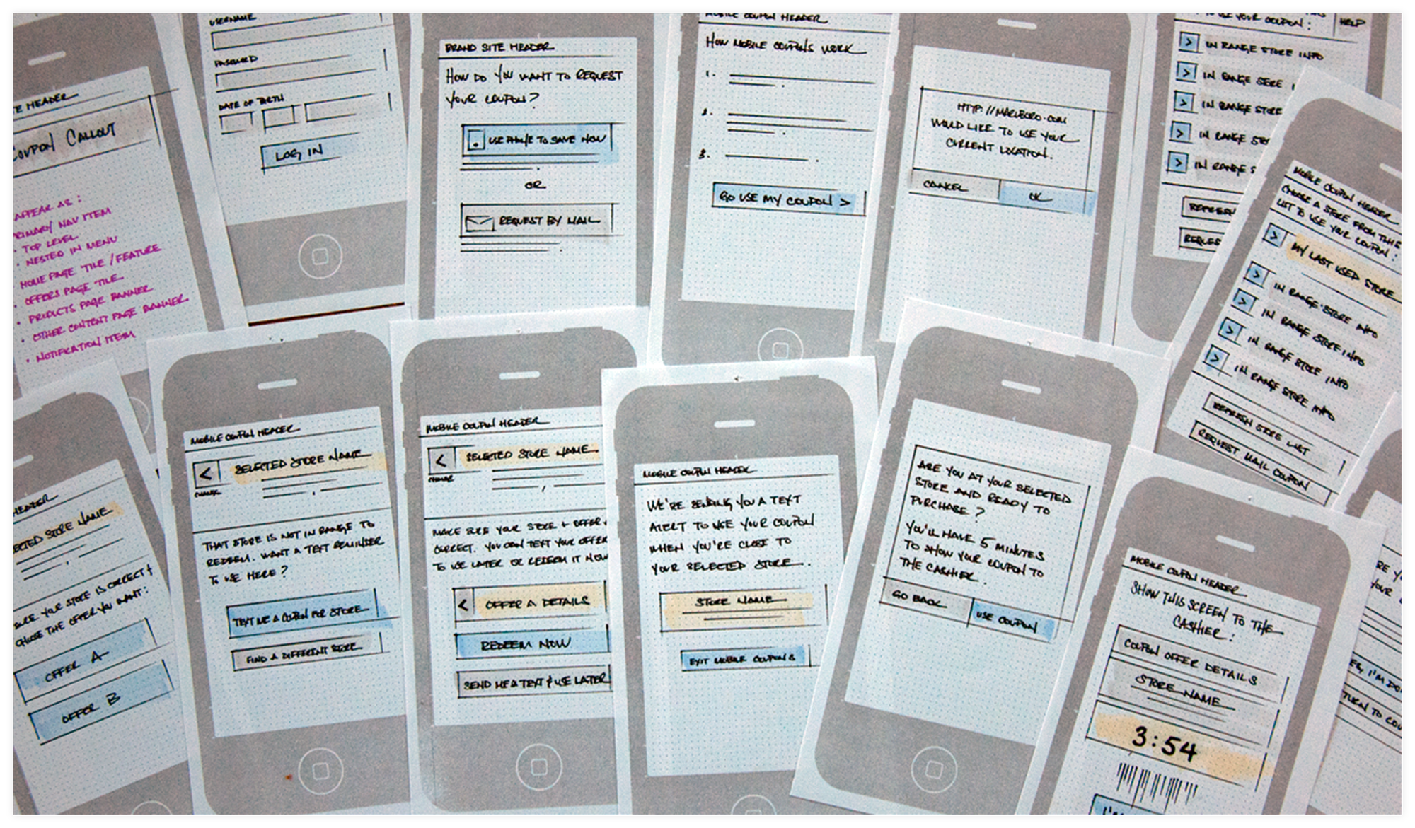 This design process required close collaboration with developers, and we moved fluidly between designing screens and optimizing flows. I outlined a set of usability principles in the early stages to serve as an ongoing reminder not to sacrifice ease of use for less complex technical solutions. Sketches advanced to prototypes, and we added features to improve convenience, such as remembering last-visited stores and enabling mobile reminders. As we wrapped up visual design, we turned our attention beyond our coupon redeemers and looked at the needs of the sales team, creating an educational prototype to help introduce mobile coupons to participating stores.